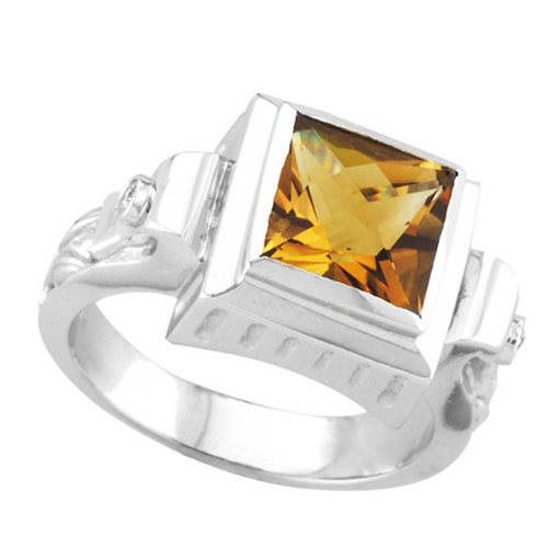 Un grand et lumineux 8mm taille princesse Citrine est complétée par deux diamants ronds taille brillant sur les cAŽtés de l'.anneau.