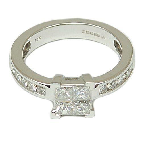 Bague de Fiançailles en Or Blanc 750/1000 et Diamant de taille Princesse 1.00carat avec Diamants sur les Côtés