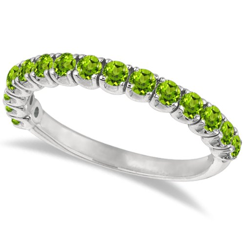 Cette bague pierre précieuse de couleur élégante et moderne met en valeur 15 balles vibrantes Peridots naturelles encerclant A mi-chemin autour de la bande. Les pierres de couleur sont définies dans un or étincelant blanc 14k quatre volets de réglage.