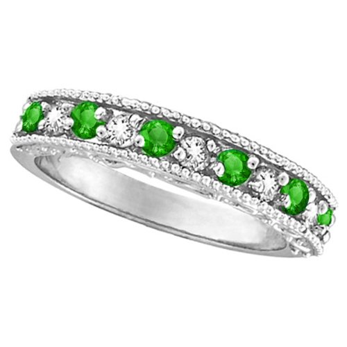Watch her face light up when you give her this Tsavorite & Diamond Ring Anniversary Band in 14k White Gold that features six vibrant green tsavorite gemstones and five brilliant-cut round diamonds that alternate along a stunning 14k white gold band. This alluring prong set ring uses beautiful eye-clean tsavorite garnets and G-H diamonds that have a SI clarity.