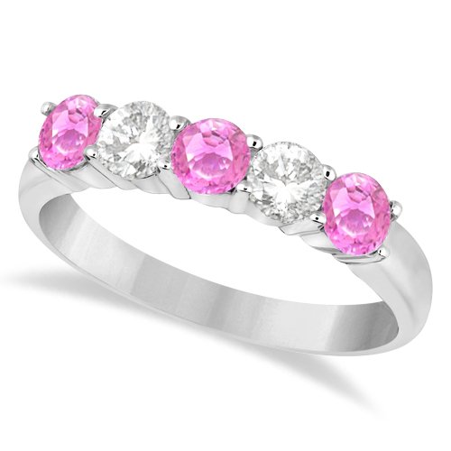 Ce superbe hAŽtel 5 diamant anneau de pierre et des pierres précieuses pour les femmes met en valeur 3 saphirs roses alternant avec 2 diamants taille brillant rond de couleur GH. pureté SI. Les pierres ont été élégamment dans un mousseux et de fantaisie en or blanc 14kt partagée broches de réglage.