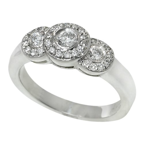 Ce magnifique trois anneaux de pierre dispose de trois diamants lunette sertie de diamants - 1 centre de pesage 0.12 ct et 2 diamants secondaires pesant chacun 0.06 ct - complétée par une trentaine de petits diamants. qui sont définies dans un cadre broche étincelante.