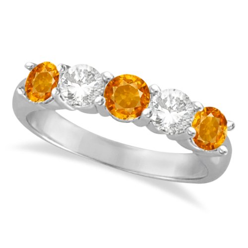 Cette pierre 5 pierre et bague en diamant pour les femmes affiche 3 pierres de citrine et 2 ronds taille brillant. diamants blancs gracieusement situé dans un cadre étincelant D'or 14kt blanc.
