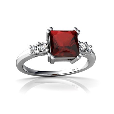 Cette bague dispose a 6mm princesse centre grenat, accentués par 4 étincelant diamants. Le poids total des pierres est1.6 carats en or 585/1000 solide.