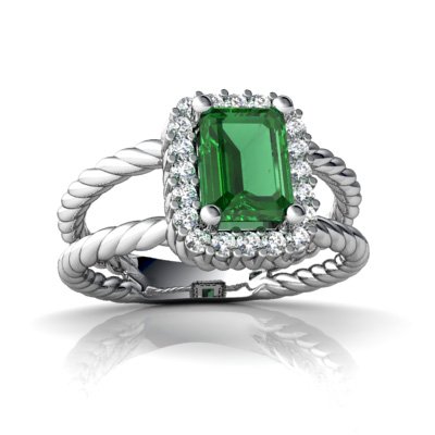 Cette bague dispose a 7X5mm rectangulaire centre emeraude, entouré d' 20 étincelant diamants. Le poids total des pierres est1.3 carats en or 585/1000 solide.
